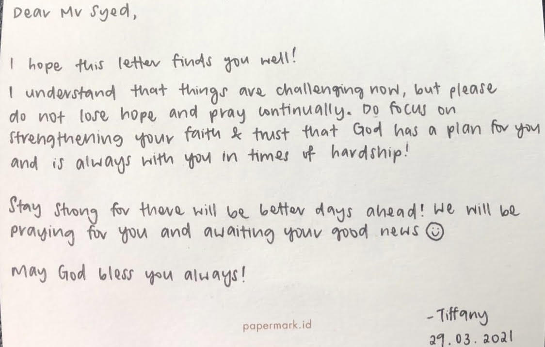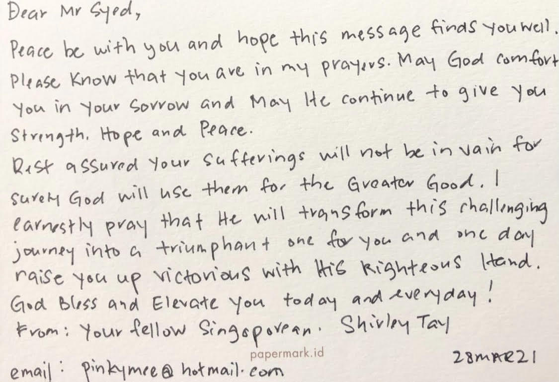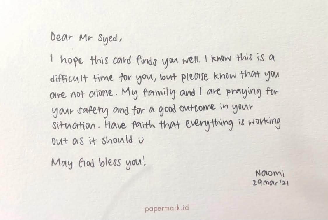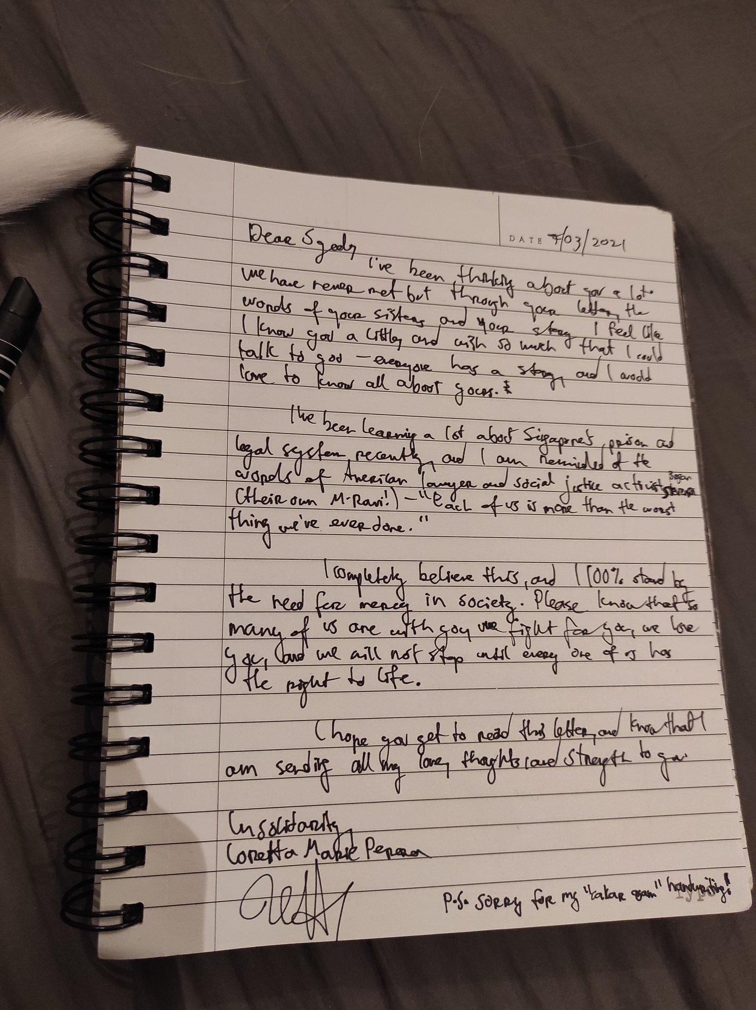 Last month, we launched a letter writing campaign dedicated towards Mr Syed Suhail, a man on death row in Singapore, with the hopes of ameliorating the sense of isolation and dehumanisation that death row inmates typically experience in their final days. We were told by his family that Mr Syed enjoys receiving and reading letters, and hope that this letter-writing campaign will serve as a source of comfort for him in the bleak days to come.