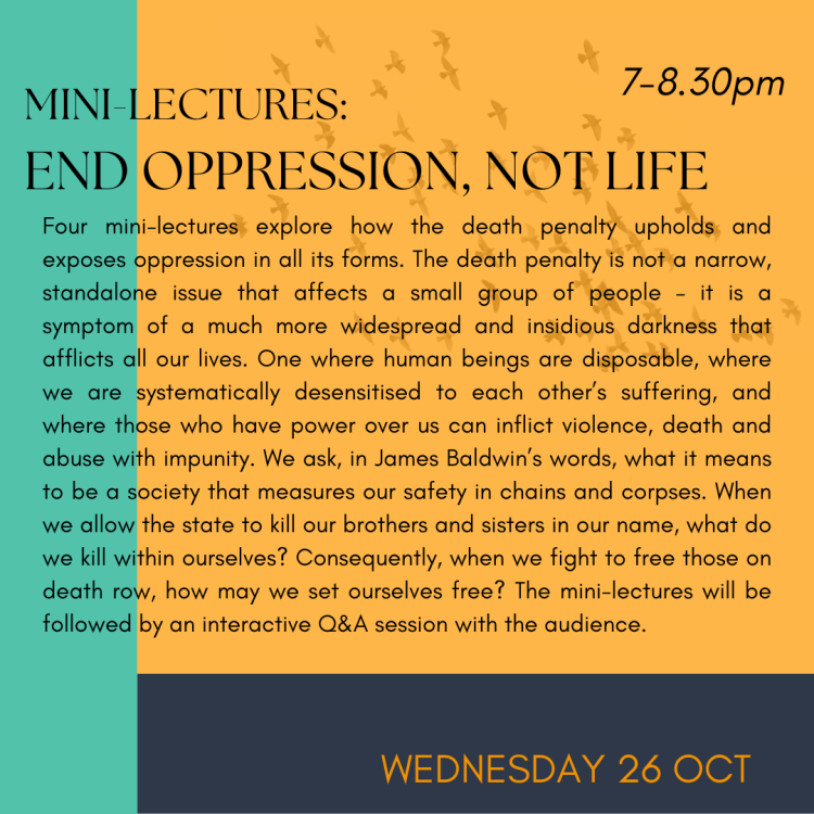 Through these events, we will examine the ways capital punishment affects all of us, create space for the voices of prisoners on death row and their loved ones, and explore different perspectives on the death penalty.