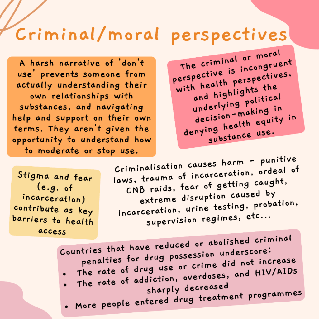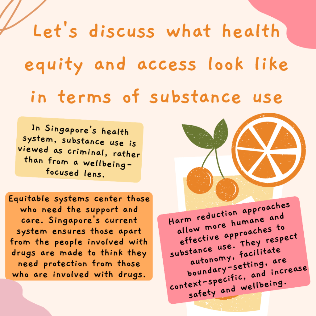 Rayner’s story highlights societally restricted, implicit yet unasked ponderings. What is the purpose of health and healthcare? What factors are at play which enable or restrict access to health? What does health equity and access look like in terms of substance use? Health is a state of complete physical, mental and social wellbeing — necessitating health rights and equity, not just about presence of disease. This is a languaging which tends to be absent in Singapore’s health system, which focuses heavily on substance use as criminal rather than from a wellbeing-focused lens. Harm reduction is also a helpful way to understand more humane and effective approaches to substance use, and is aligned with aspects of health and wellbeing. It is a liberating framework which respects autonomy, facilitates boundary-setting and protecting, while increasing safety and wellbeing, and is context-specific in catering to specific needs and support.