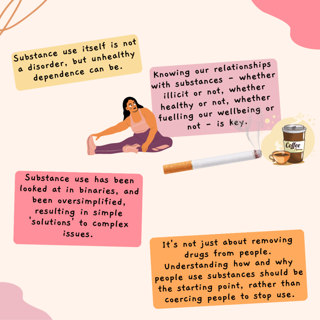 Substance use in itself is not a disorder, but unhealthy dependence can be. Many of us imbibe substances in daily life — coffee, alcohol, nicotine and more, and knowing our relationships with substances, whether illicit or not, whether healthy or not, whether fuelling our wellbeing or not, is key. Individuals would be able assess these and discover what works for them individually through education around substance use — access to resources (e.g. institutions which can provide information), a mix of local and international research (the former of which is sorely lacking), and trauma-informed approaches. We know that it is not about simply removing drugs from people — there are complex underlyings and a mix of approaches grounded in harm reduction, drug demand reduction and rehabilitation serve the individual much more effectively than criminalisation. We also need to recognise that for those involved with drugs, substances are looked at as a solution rather than a problem — a narrative that is well-established in recovery rooms and rehabilitation. Understanding how and why people use substances should be the starting point, rather than coercing people to stop use. Substance use has been looked at in binaries, and therefore been oversimplified, resulting in simple ‘solutions’ to complex issues.