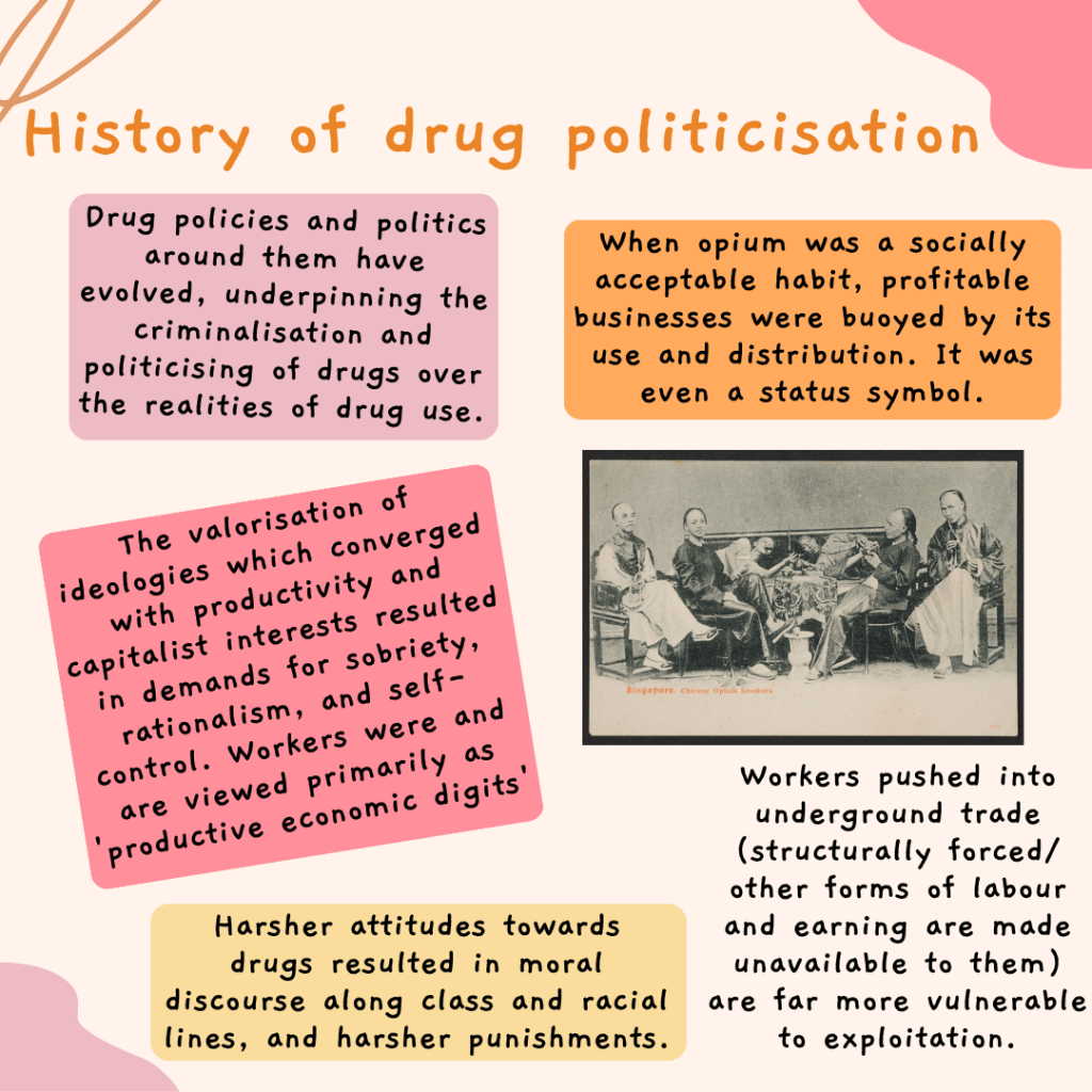 It is also necessary to understand the evolution of drug policies and politics around them, which underpins the criminalisation of drugs and politicising of drugs over the realities of drug use. Back when opium was a socially acceptable habit, profitable businesses were buoyed by its use and distribution, and it was even a status symbol. Following Singapore’s independence, which was undergirded by neoliberalism, the valorisation of ideologies which converged with productivity and capitalist interests resulted in demands for sobriety, rationalism, and self-control. Workers were viewed primarily as ‘productive economic digits’. This created the need for harsher attitudes towards drugs, and a resulting moral discourse along class and racial lines (e.g., ‘ghettoising’ behaviour). Higher rates of relapse and recidivism led to harsher and harsher punishments. Creation of the misuse of drugs act, zero tolerance policy, Singapore’s mirroring of the UN narcotic drugs policy, and the unscientific classification and reclassification of different drugs all worked hand in hand to concretise the criminalisation of drugs.