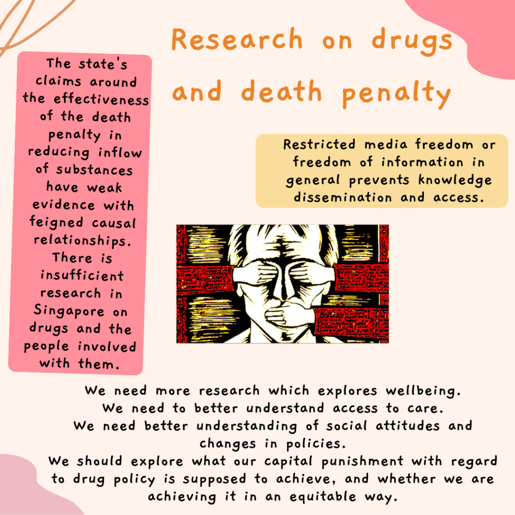 Despite the strong ‘drug-free country’ narratives that Singapore espouses, there has been insufficient research on drugs and the people involved with them. The state has made claims around the effectiveness of the death penalty in reducing inflow of substances, but it is weak evidence with feigned causal relationships, therefore the claims are not robust. Are these rhetorics grounded in sound research or are they fashioned to create moral panic? Given that the environment is aggressive with wide-reaching government propaganda, and with little data transparency, research on attitudes and other aspects related to drugs is much more fraught and far less instructive. There is also restricted media freedom or freedom of information in general, thus knowledge dissemination methods are not made, nor are made accessible.
