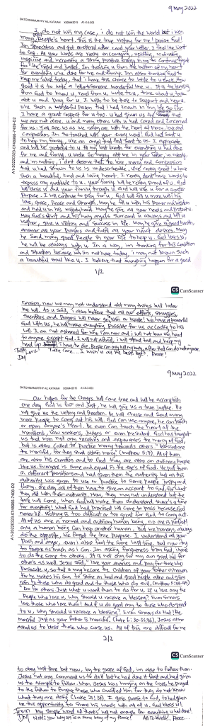 I may not win my case, I will not win the world, but I won many good people’s hearts. This is the true victory for me! Praise God! I am speechless and got emotional after reading your letter. I feel like I want to cry. All your words are really encouraging, uplifting, motivating, inspiring, and increasing a strong positive energy in me to continue fighting for what is right and justice. I’m thanking you from the bottom of my heart for everything you’ve done for me and my family. I’m also thanking God to keep me alive today, that I have this chance to write you back. How good it is to write a letter to someone wonderful like you. It is a blessing from God to know you, read from you, write to you, think about you, talk to you, and pray for you. I wish to be there to support you and help you. You’re such a wonderful person that I had known in my life so far. I have great respect for you too. You have given us the strength in knowing we are not alone. You and many others with you have care and concern for us. I’m so touched by your every word! You all see us as we really are with the heart of mercy, love, and compassion. God had sent you to help my family, you are an angel that God has sent to us. I appreciate and will be grateful to you until my very last breath for everything you have done for me and my family. You wrote so highly of me in your letter. I am nobody, and I’m nothing. I don’t deserve that. The love, mercy, and compassion that you had shown to us is indescribable. You are really great! You have such a beautiful, kind, and loving heart. I really don’t have words to express my gratitude to you. Your family will be really proud of you. God will bless you and your family through you. God will fill you more with his love, grace, peace, and strength. May He fill you with His power and wisdom and hold you in His mighty hand. May He give all your needs and protect you. May God’s spirit and his holy angels surround you always and lift you higher, give you victory and success in life. May He give you good health, answer all your prayers, and fulfil all your heart’s desires. May he send many good people to you in your life to help you. God loves you, He will always be with you. In a way, I’m thankful for this condition and situation because if I’m not here today, I may not know such a beautiful soul like you. I believe that everything happens for a good reason. We may not understand many things now but later we will. As you said, I also believe that all our efforts, struggles, sacrifices and prayers will never go in vain or waste! We have a powerful God with us, He will make everything possible for us according to His will. I am not ashamed of who I am now, and I will not bow my head to anyone except God. I will not be afraid, I will stand tall and keep my head up even though I have to die. People can only kill my body, after that they can do nothing more. Take care… I wish you all the best. Bye2. Peace!