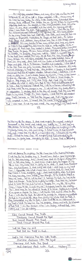 I am not a highly educated person, and many of us here are from the same background. If all of us got a proper education in life, I think many of us wouldn’t be here today for doing the most foolish things. Educated people always think differently from people like us. To me, prison is my university, especially death row. I am studying at a high level of education that cannot be learnt from other universities around the world. I am learning about life! When I look back on the path that I came from so far, I feel joy from the achievement, fulfilment, and enlightenment in my spiritual life. It’s really painful to see many people here lose hope, lose faith, and many of them are relying on psychiatric medications to forget all their pain, to relieve their stress and distress. Many of them are like lost sheep without a shepherd. It’s very painful to see that many of them don’t have any chance or hope in their cases. They don’t know how to read or write english. 10, 20, or 30 years of their lives were wasted in prison. They have come to prison many times since they’re so young til now. Some of them don’t have a family, are not married, have no children, are without property, they have nothing. ZERO! I can’t take it, to see their lives wasted this way. All of them are very friendly, though many of them are not highly educated, they are really talented. Some of them can sing well, draw well, and can make handicrafts by using only paper and glue. Life is so precious, beautiful, and wonderful. I can’t take it, to see these lives are going nowhere, stuck here in this darkness. It’s really hard and challenging to be hopeful, stay positive, or pray in this negative environment, full of negative vibrations. Without a God, I don’t think I can do what I’m doing now. I am a weak person on my own, I have a 1000 reasons to give up, lose hope, get angry and frustrated, to hate or scold, to fight or stop praying and many other things. But I need only one reason to continue doing what I’m doing now, that is love! That is God! Because God is love… And my loved ones! Without this, I will be a person without any hope and there won’t be any change in me. I will not have any goals, dreams, or expectations. I was already dead on the day of my arrest, that is still fresh in my mind. Though it’s been 11 years, I just feel like I got arrested yesterday. That’s because I still feel like I’m 26 years old. That was my age when I was arrested in 2011. I have not seen the world since then, and the world that I was in is not my real world now. The only thing that I have in my heart now is to live my life for others. I don’t want anything for myself. Nothing is permanent in this world and nothing can satisfy me. I don’t have any little desires to live my life for myself. God had given me everything in my life – my family, house, car, job, and money. I failed to use all that in a correct way and I did not live my life in a meaningful way. I failed to do my duty and I failed to take care of everything that God entrusted to me. And now, I’m giving back everything to God. I know that I’m not worthy and not deserving of anything. The life I have now is for God and His people. I will live for his purpose only. I should have died a long time ago, but I’m still alive today. And I should have died on 29 April, Friday, 2022, but I am still alive today. I don’t know what’s going to happen to my life or how long I’m going to be alive. I don’t have the answer now, only God knows. I don’t worry about what I don’t have in my hand now, I appreciate what I have now. I have God, if I have God that means I have everything and I don’t need anything else. God gave me every new day, new breath, and new strength. If he wants to stop it or take me back, let His will be done! I belong to God, he has all the right and power to do to me what he wants. God loves me, he knows what is best for me and he has a purpose for my life. If my time comes, I have to go. I can’t say No! Everybody has to die one day. So i don’t have to be afraid or shocked if it comes. Nothing is in my hand, if I am given a chance to live, I will live for God and if I have to die, then I will die for God. It will not be enough to express my gratitude to God in my whole life other than giving my whole self to God. I fully surrender my life to God, I just want to be an instrument in my God’s hand to use me for his purpose, plans, and will. It is because of God that I am the person who I am today. Without God, I am nothing and I can do nothing.
