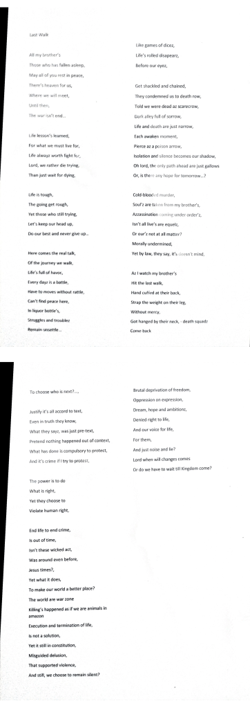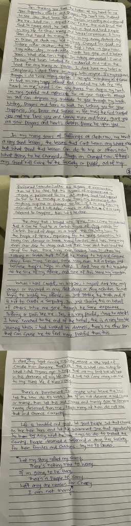 What allows me to be alive today? Is it the words from the judge, the law, my family, me or God? If man has power under the law to exercise mercy, then who is deserving of it? I don’t see anyone from death row that has received a presidential pardon, why? What do the death row inmates need to earn to be alive, to live their lives? If there is no law, there’s no punishment, then crimes will increase. Everyone knows this! But is the law there, only to punish the offenders to deter the crime? Has the same law not been practised to rehabilitate and reform the offenders, to not reoffend again, so that it also can deter the crimes? I am a first-time offender, what is the proof in the law to say that I will not reform or change? Why are the drug offenders on death row not given the chance to reform, especially first-time offenders? Why are we not in the list or category for rehabilitation?