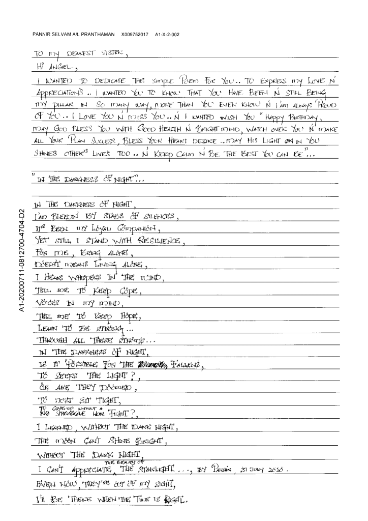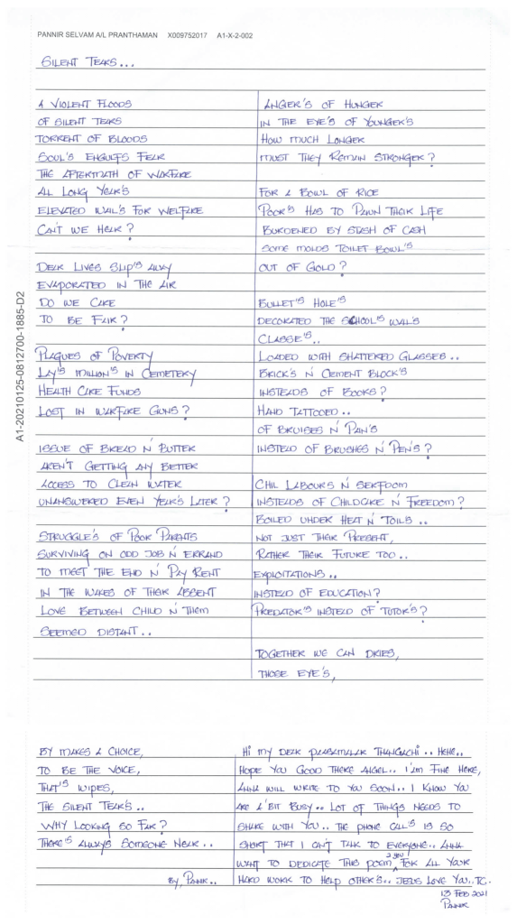 The following are letters, poems, and reflections written by Datchina, Kalwant, Nagaenthran, Pannir and Syed on their experiences being on death row, and their messages to loved ones.