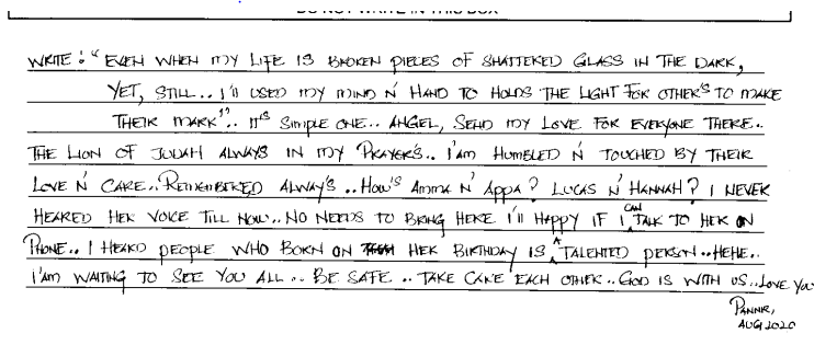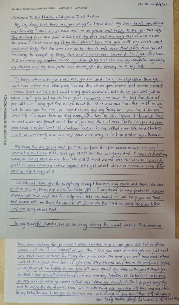 Tell Sukhjeet thank you for everything abang. I love him very much and please take care of phen and my Baby girl also. You baby girl, if anything or any problem you can always call him and ask for help and take my word he will help you ok. Now, that mama will be there for you ok. Tell Savin I’m too tired to write another letter and I’m sorry about that.