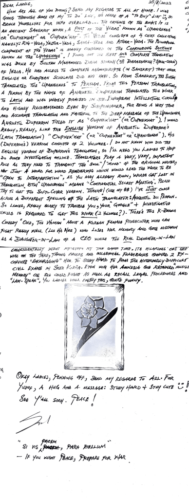 How are all of you doing? Send my regards to all at home. I was going through some of my “to do” list, it’s more of a “to buy” list ☺, so brace yourselves for info overload…the origins of the book: it is an ancient Sanskrit work, a part of the “Vedas” known as “Lipanishads” or “Oupnekhat” or “Oupenk’hat”. The “Vedas” consists of 4 chief collections namely: Rig-veda, Yatur-veda, Sama-veda and Athar-veda. The philosophical component of the “Vedas” is mainly contained in the concluding sections known as the “Lipanishads”. I found out the best and complete translation was done by Sultan Mohammed Dara Shikoh (or Darashakoh? Spell-check) of India. He had access to complete manuscripts (in Sanskrit) that other English or European scholars did not have. So from Sanskrit, the Sultan translated the “Lipanishads” to Persian. From this Persian translation, a person by the name of Anquetil Duperron translated this work to Latin and was widely praised in the European intellectual circles, and highly recommended even by Schopenhauer, for being a very true and accurate translation and faithful to the deep message of the Lipanishads. Anquetil Duperron titled it as “Oupnek’hat” (or “Oupnekhat”). I would really, really, like the English version of Anquetil Duperron’s (Latin translation) “Oupnek’hat” (or “Oupenkhat” or “Lipanishads”). His (Duperron’s) version consists of 2 volumes. I do not know who did the English version of Duperron’s translation, so I’ll need you ladies to help do some investigation online. Translators play a very, very, important role as they need to translate the “soul”/“mood” of the original writer, not just a word for word rendering which would lead the work to be “open to interpretation”, as you may already know, words get lost in translation. Btw “Lipanishads” means “confidential secret meeting”. Please try to get the soft-cover version. Thanks! (use my $$) I’ve just come across a different spelling of the Latin translator: Anquetil Du Perron. So ladies, really sorry to trouble you, your “Google” + investigative skills is required to get this work (2 volumes?). There’s this K-drama comedy “One, the Woman” about a Korean female prosecutor who can fight really well (Lee Ha Nee) who loses her memory and gets mistaken as a daughter-in-law of a CEO while the real daughter-in-law coincidentally went missing at the same time. It’s hilarious cos she was on the take, taking bribes and occasional flashbacks showed 2 ex-convicts “encouraging” her to study hard to pass the notoriously difficult civil exams in South Korea. Even with her amnesia she retained “muscle memory” cos she could fight as well as recall legal procedures and “law-speak”. You ladies will enjoy this, quite funny.