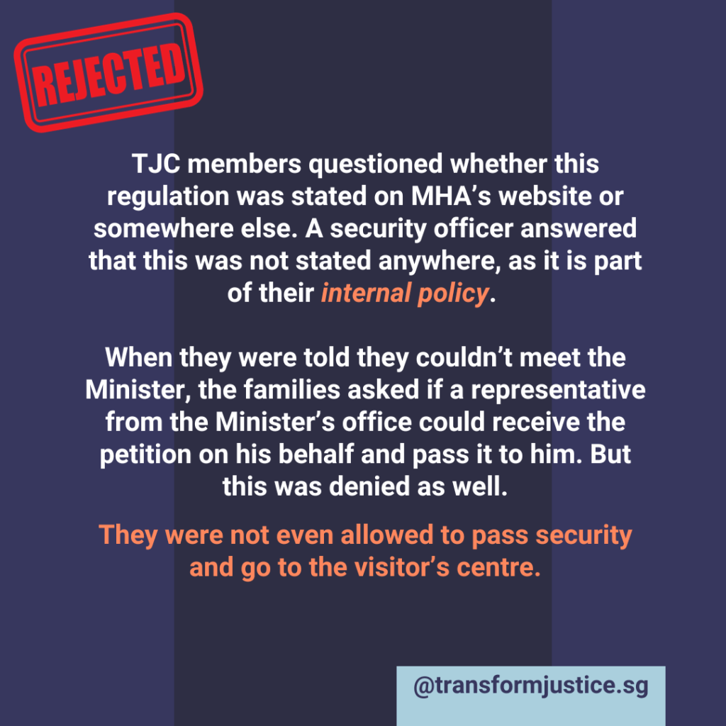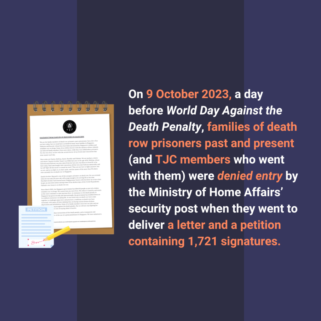 On 9 October 2023, a day before World Day Against the Death Penalty, families of death row prisoners past and present (and TJC members who went with them) were denied entry by the Ministry of Home Affairs’ security post when they went to deliver a letter and a petition containing 1,721 signatures.