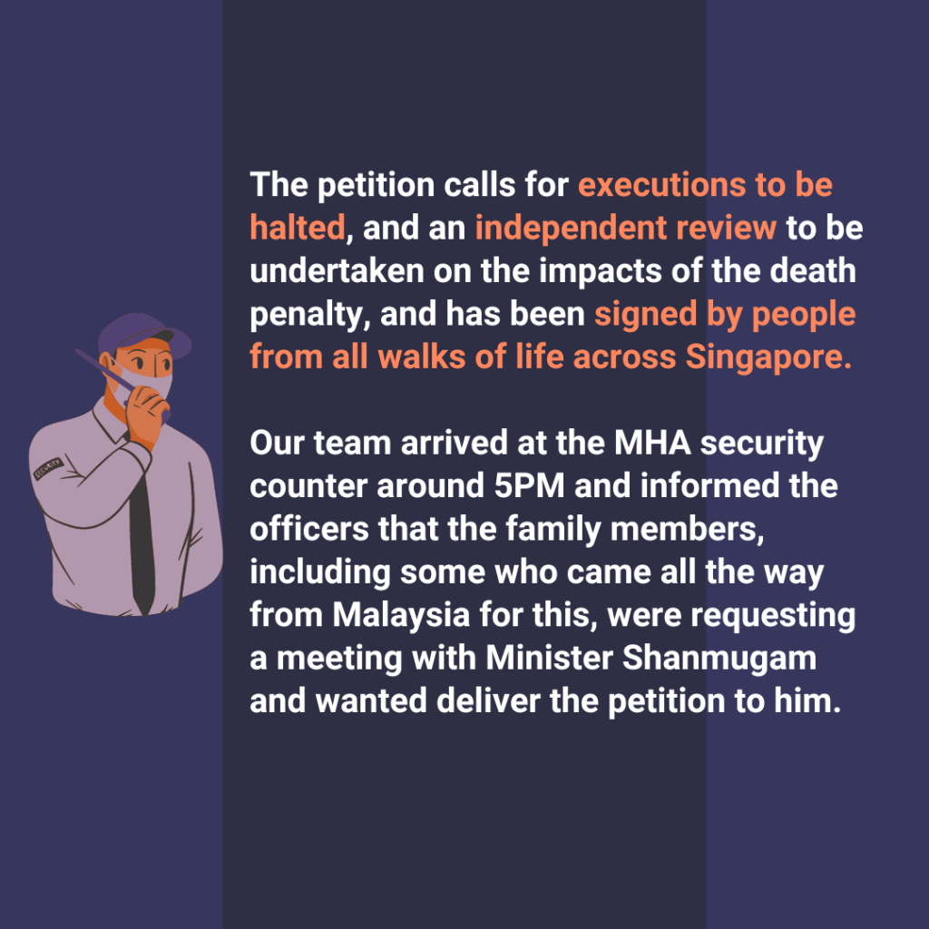 Our team arrived at the MHA security counter around 5PM and informed the officers that the family members, including some who came all the way from Malaysia for this, were requesting a meeting with Minister Shanmugam and wanted deliver the petition to him.