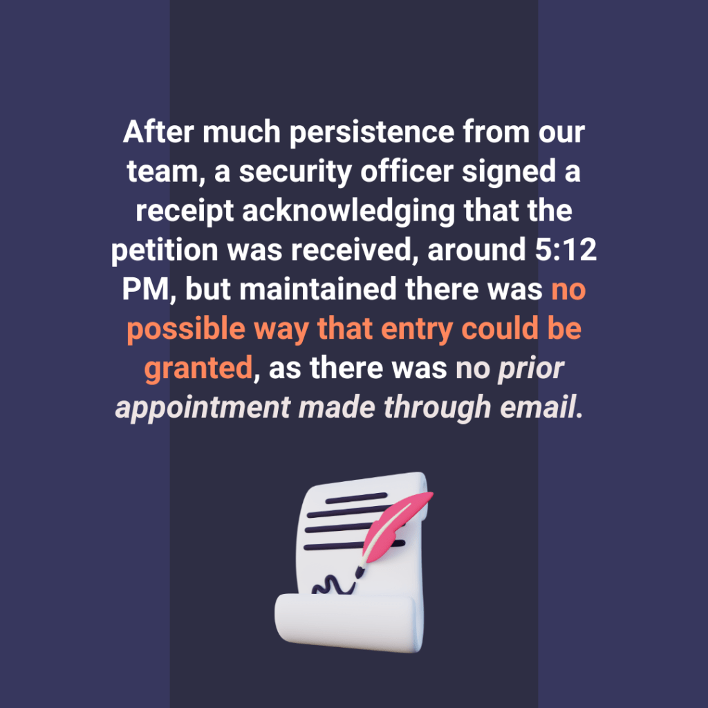 After much persistence from our team, a security officer signed a receipt acknowledging that the petition was received, around 5:12 PM, but maintained there was no possible way that entry could be granted, as there was no prior appointment made through email.