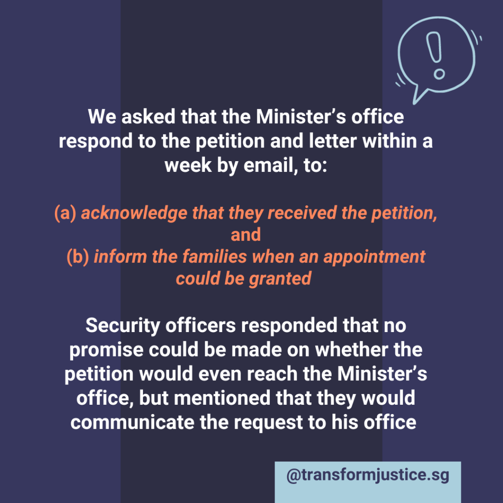 The families have since emailed Minister Shanmugam and his office the petition and signatures that they went to deliver that day. They have asked for an in-person meeting, since the security said all appointments have to be made via email. They are yet to hear back.