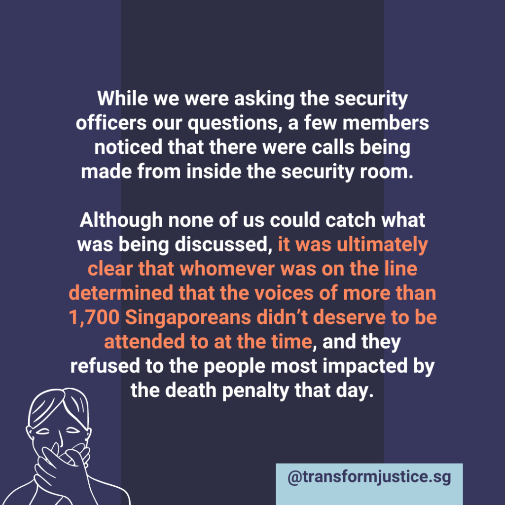 Although none of us could catch what was being discussed, it was ultimately clear that whomever was on the line determined that the voices of more than 1,700 Singaporeans didn’t deserve to be attended to at the time, and they refused to the people most impacted by the death penalty that day.