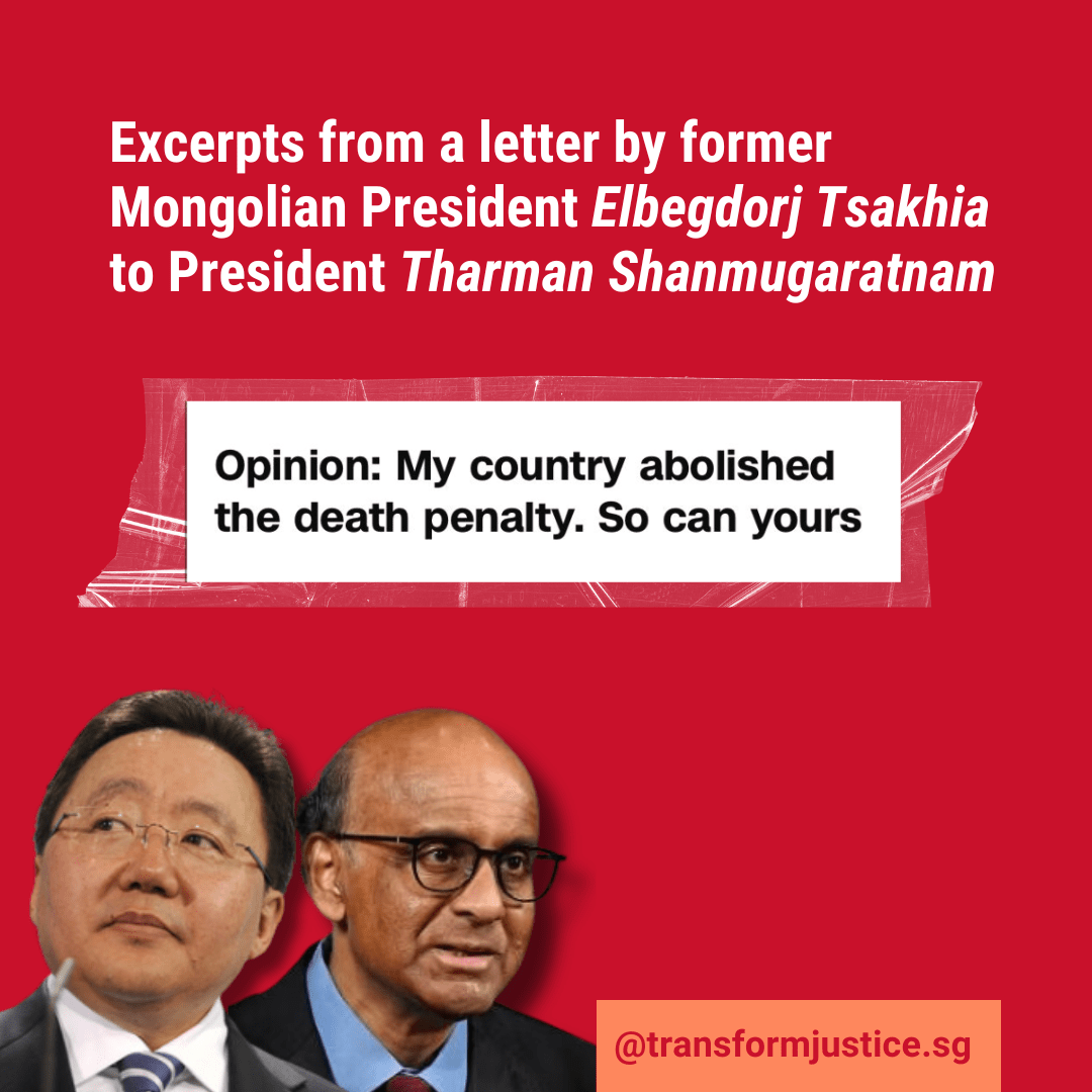 Former Mongolian President Elbegdorj Tsakhia writes to Singapore’s newly elected President Tharman Shanmugaratnam. The letter highlights Singapore’s shocking record of executions and calls on the newly elected president to play a role in ending the death penalty.